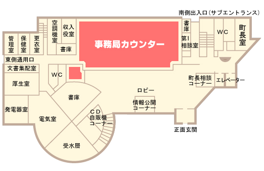 窓口付近にはソファーを配置するなど、手続き時間を少しでもくつろぎ時間としていただけるよう、「心地好さ」に気を配りました。近代的な機器を用い、町民のみなさんへの行政サービスの向上と効率化を、今後さらに図っていきたいと思っています。