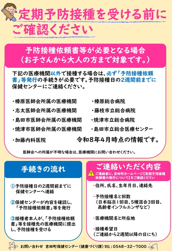 ↑榛原医師会、志太医師会、島田市医師会、焼津市医師会に所属している医療機関、もしくは町と契約している医療機関であれば、予防接種依頼書は必要ありません。