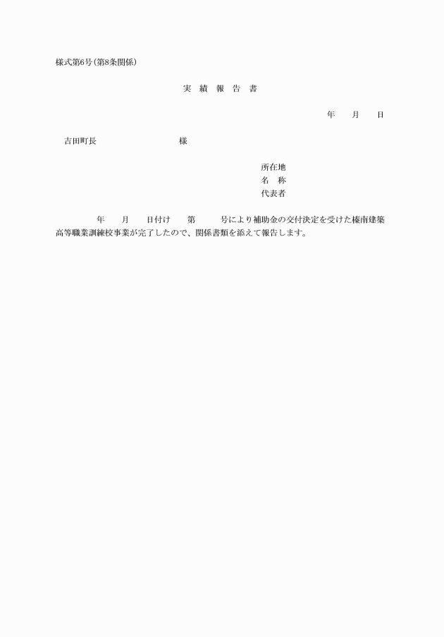 第8条 訓練校は、補助事業が完了したときは、実績報告書(様式第6号)に次に掲げる書類を添えて、補助金の交付の決定のあった日の属する年度の翌年度の4月30日までに町長に提出しなければならない。