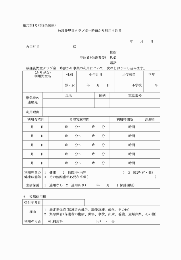 第7条 事業を利用しようとする児童の保護者(以下「申込者」という。)は、利用しようとする日の5日前までに放課後児童クラブ室一時預かり利用申込書(様式第1号)を町長に提出しなければならない。ただし、緊急性が高い場合は、口頭により申込みを行い、事後に申込書を提出することができる。