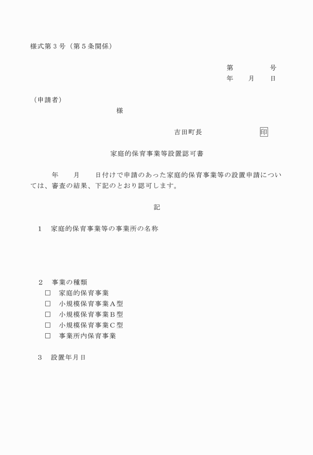 第3条 児童福祉法第34条の15第2項の規定による家庭的保育事業等のうち、家庭的保育事業、小規模保育事業又は事業所内保育事業の設置認可を受けようとする者は、家庭的保育事業等設置認可申請書(様式第1号)を町長に提出しなければならない。